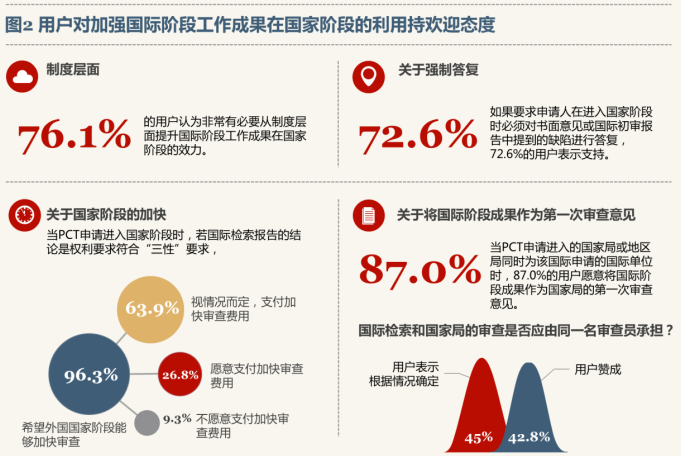 在2015年的调查中,70.9%的用户提出希望在国际检索阶段增加与审查员沟通的机会,2016年上述比例增长到78.1%。针对以上建议,国家知识产权局2017年开展了PCT国际阶段增加沟通机会试点工作。从部分企业提交的PCT申请中选取30件,探索就国际阶段检索结果与申请人沟通的有效方式及程序。2017年调查问卷统计显示,高达92.3%的用户认为有必要在PCT申请国际阶段与审查员沟通,其中认为非常必要的占43.5%。用户希望采用诸如电话、电子邮件等方式与审查员沟通,以便国际阶段审查员能够准确把握专利申请的技术方案。深访也显示,用户希望如普通国内专利申请的专利审查一样,有机会与审查员就技术方案的内容进行沟通交流。 (二)用户对加强国际阶段工作成果在国家阶段的利用持欢迎态度 用户认为国际阶段工作成果更多地在国家阶段得到利用,将有利于加快国家阶段的审查、节省成本。问卷统计显示,76.1%的用户认为非常有必要从制度层面提升国际阶段工作成果在国家阶段的效力。 72.6%的用户支持在进入国家阶段时对书面意见或国际初审报告中提到的缺陷强制进行答复,并希望推动国际阶段的成果能够更大程度地应用于国家阶段。 当PCT申请进入国家阶段时,若国际检索报告的结论是权利要求符合“三性”要求,96.3%的用户希望国家阶段能够加快审查。如果需要为加快审查支付费用,63.9%的用户表示会视情况而定,26.8%的用户愿意支付费用,仅有9.3%的用户不愿意支付费用。 当PCT申请进入的国家局或地区局同时为该国际申请的国际单位时,问卷统计显示,87.0%的用户支持将国际阶段成果作为国家局或地区局的第一次审查意见,以此缩短国家阶段审查周期、快速获得授权。对于国际检索和国家局的审查是否应由同一名审查员承担,42.8%的用户表示赞成,45%的用户表示根据情况确定。