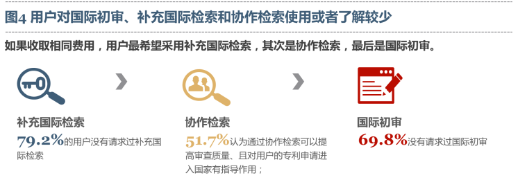 (三)用户对国际初审、补充国际检索和协作检索使用或者了解较少 问卷调查显示,对于国际初审、补充国际检索(国家知识产权局尚未开展)和协作检索(国家知识产权局2018年启动试点),79.2%的用户没有请求过补充国际检索,69.8%的用户没有请求过国际初审。51.7%的用户认为通过协作检索可以提高审查质量、且对用户的专利申请进入国家阶段有指导作用,但也有部分用户担心协作检索过于全面,对申请进入某些国家或地区会有负面影响。如果收取相同费用,用户最希望采用补充国际检索,其次是协作检索,最后是国际初审。